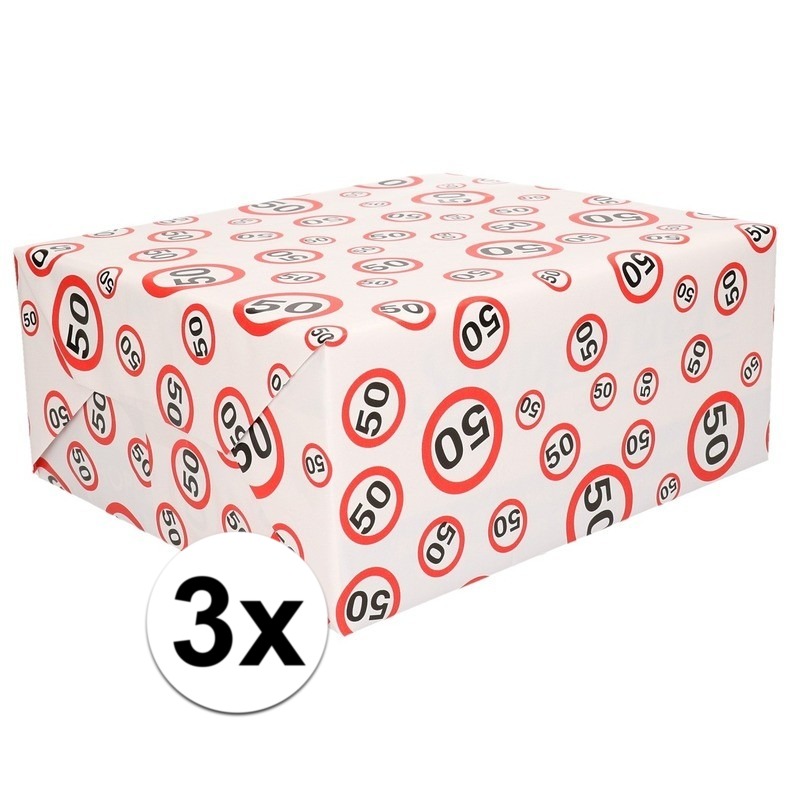 3x inpakpapier met 50 jaar verjaardag print in rood/witte verkeersborden. Een rol cadeaupapier met een 50 jarige verkeersborden print. Je ontvangt een rol cadeaupapier met een extra groot formaat van 70 x 300 cm. Materiaal: papier. Feestartikelen/versiering.