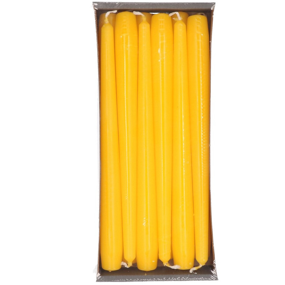 Dinerkaarsen set van 12x stuks in de kleur geel met lengte 25 cm en 8 branduren. Verpakking met taps toelopende dinerkaarsen zonder geur met gladde afwerking. U kunt de lange kaarsen gebruiken bij het dekken van de tafel, of gebruiken als sfeermakers in kandelaars/kandelaren.