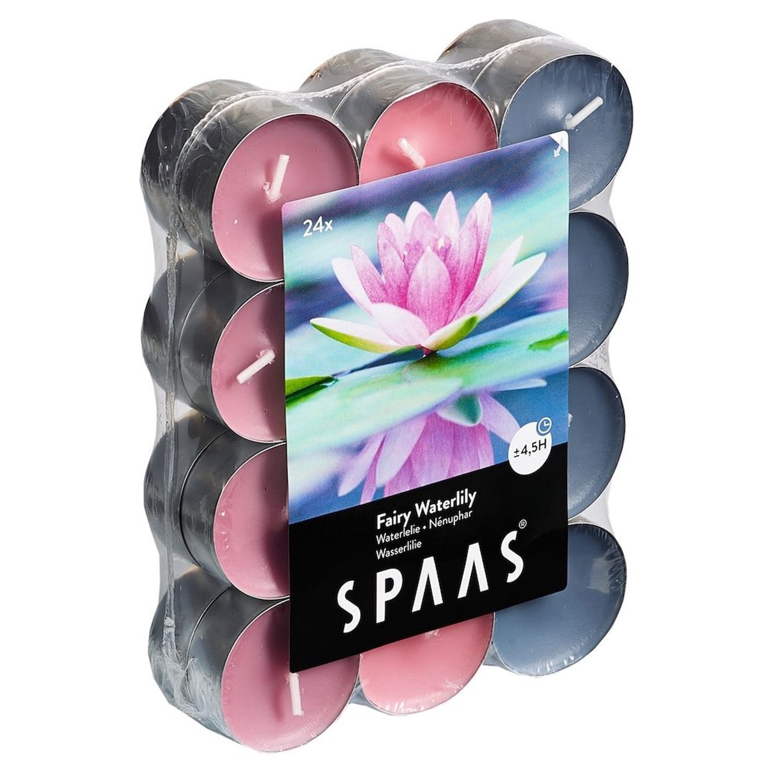 24x geurende Spaas waxinelichtjes. Breng een warme en zoete sfeer in huis met deze set van 24x geurtheelichtjes in de betoverende geur Fairy Waterlily. Elk waxinelichtje heeft een brandduur van ongeveer 4,5 uur, waardoor je langdurig kunt genieten van de heerlijke geur van friszoete waterlelies. Perfect voor een ontspannen avond, een romantische setting, of gewoon om je interieur te verfrissen met een subtiele en aangename geur. Deze theelichtjes zijn ideaal voor in je favoriete waxinelichthouder en geven een zacht, sfeervol licht.
