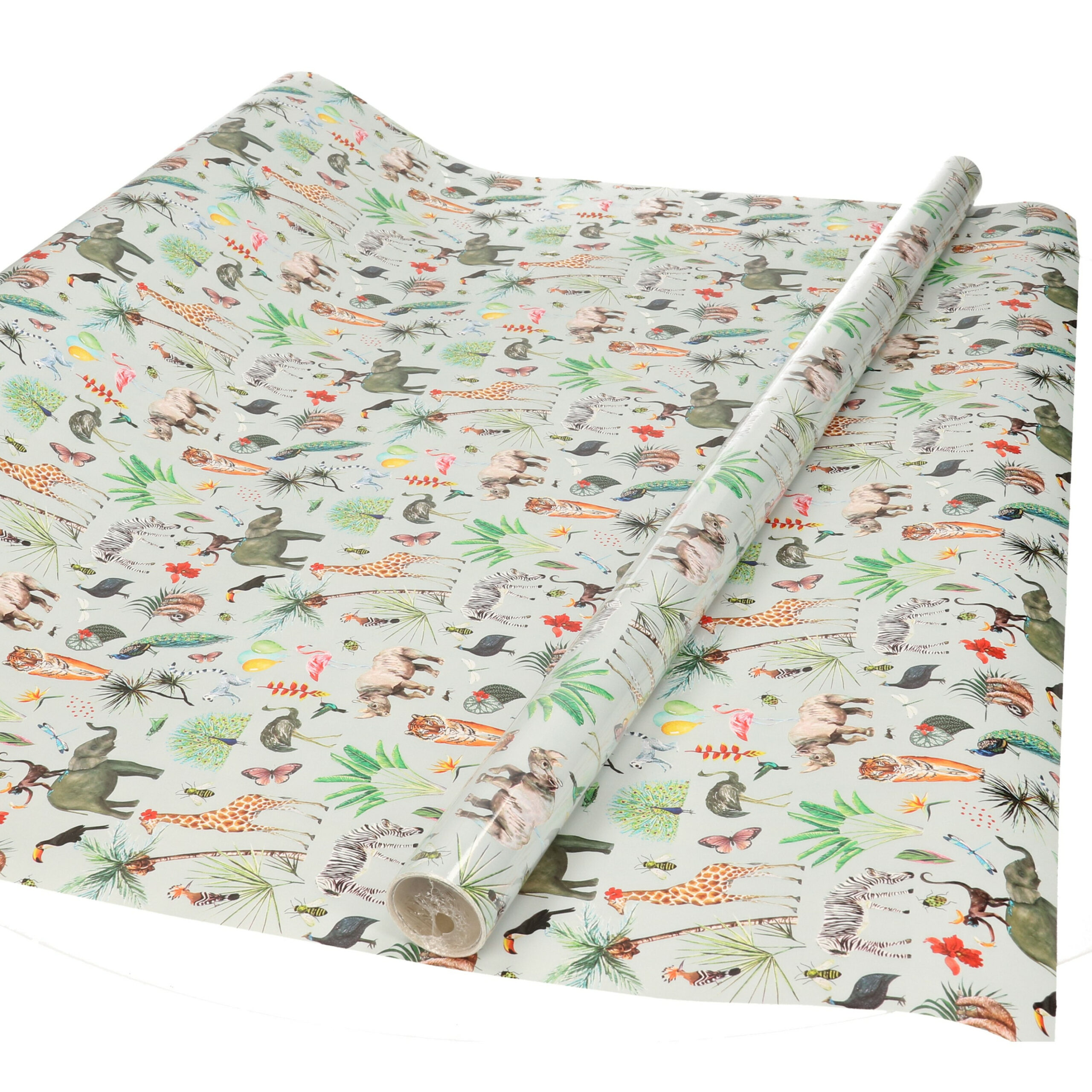 Inpakpapier/cadeaupapier jungle thema. Leuk kadopapier met kleurrijke prints van dieren uit de jungle. Materiaal: papier, 80 grams kwaliteit. Formaat: ca. 300 x 70 cm. Type: Jungle.