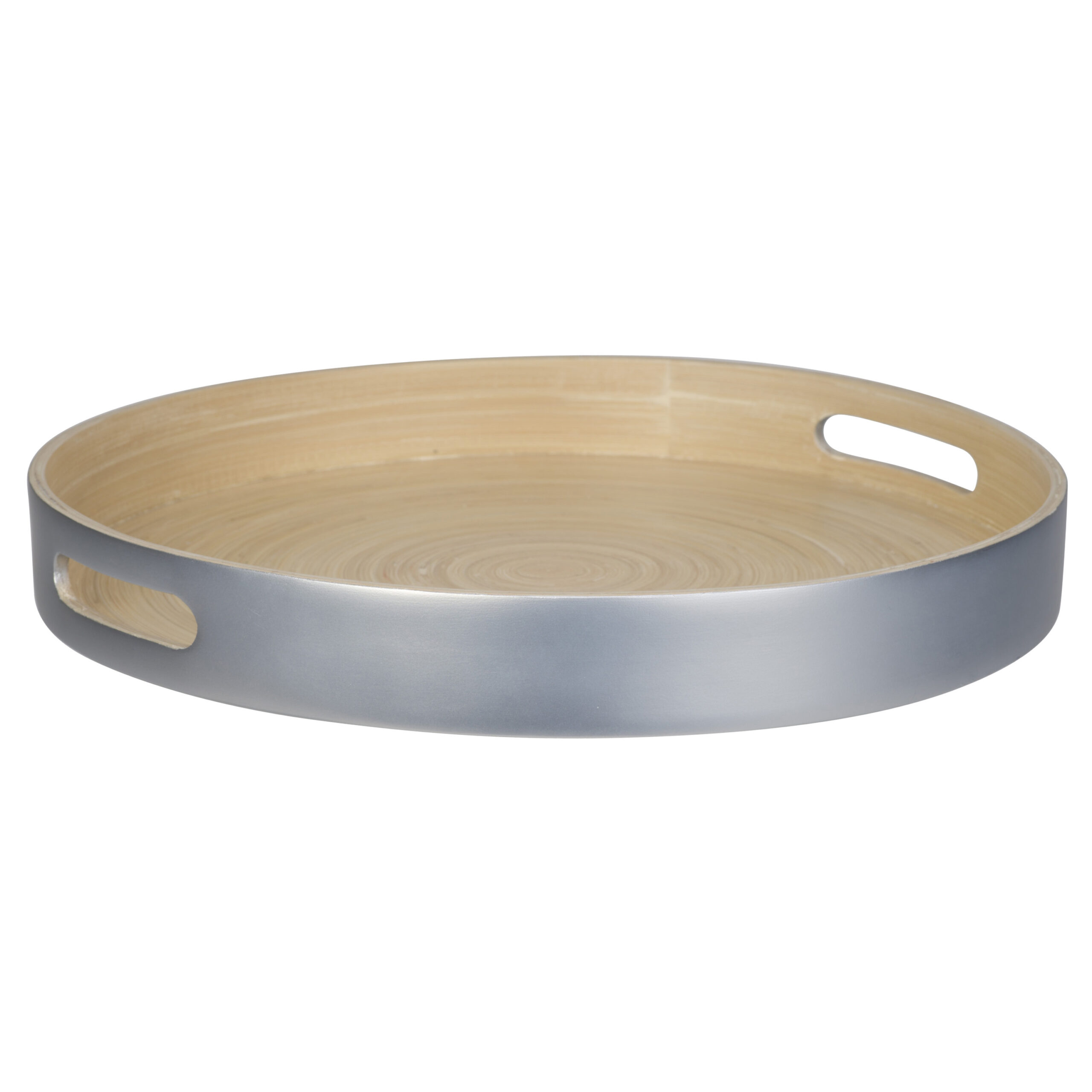 Kaarsenbord/kaarsenplateau dienblad zilver rond. De onderzetter/plateau heeft handige handvaten en een opstaande rand van 4 cm. Voor stompkaarsen en Led kaarsen. Formaat: diameter 30 cm. Materiaal: bamboe.