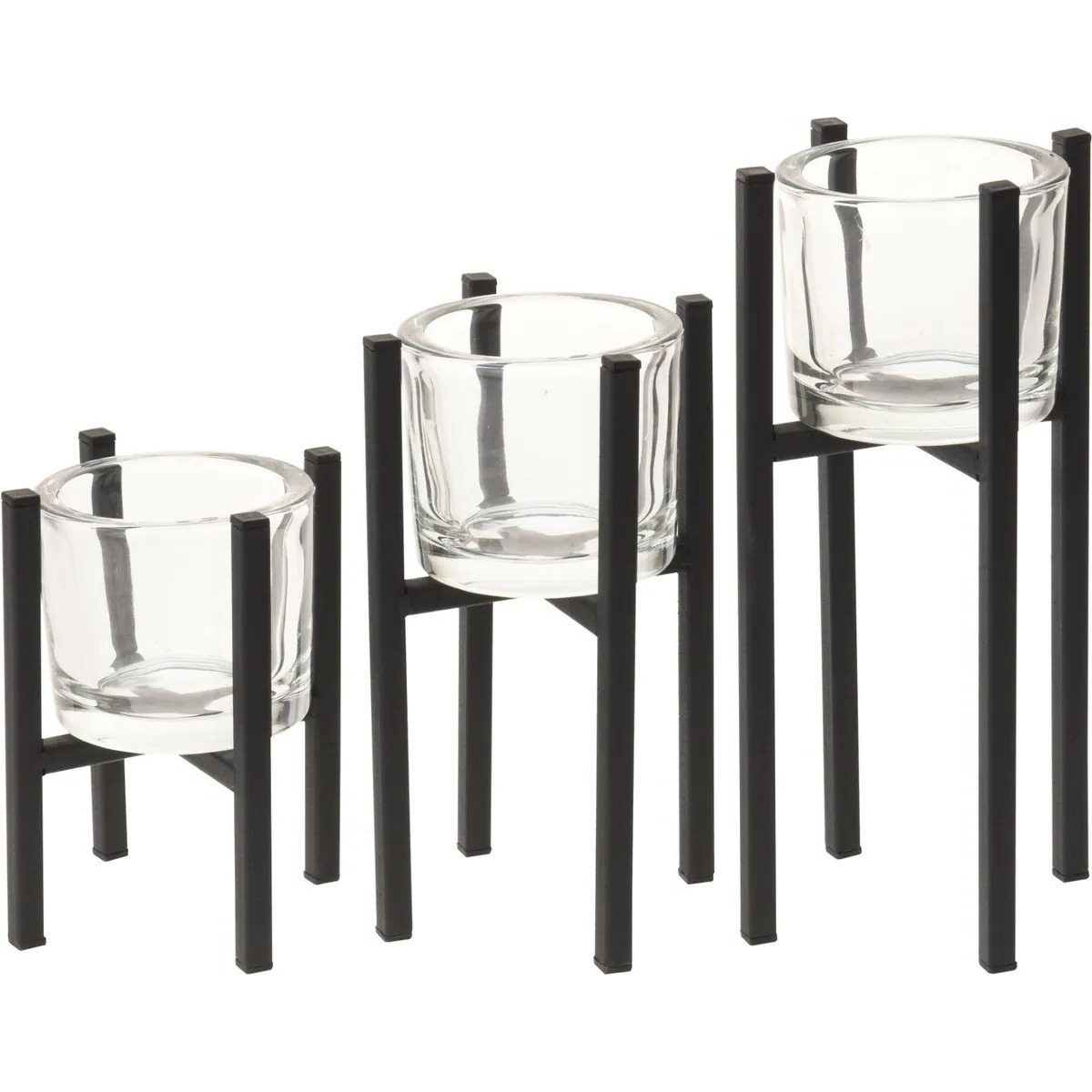 Deze set van 3x stijlvolle theelichthouders combineert glas met een metalen frame en brengt sfeer in elk interieur. De houders hebben verschillende hoogtes (ca. 25, 20 en 15 cm) met een diameter van 10 cm, waardoor ze mooi samen of los te plaatsen zijn. Perfect als woondecoratie op tafel, dressoir of in de vensterbank. De glazen binnenkant zorgt voor een warme gloed van het kaarslicht, terwijl het metalen frame een moderne uitstraling geeft. Voor een gezellige en elegante sfeer in huis.