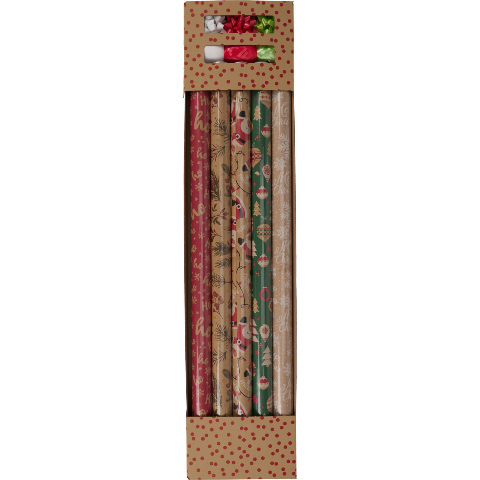 11-delige set kerst inpakpapier. Maak je kerstcadeaus extra bijzonder met deze 11-delige set kerst inpakpapier/cadeaupapier en cadeauaccessoires! Deze set bevat alles wat je nodig hebt om je geschenken prachtig in te pakken en te decoreren voor de feestdagen. De set bestaat uit een selectie van kraft designs in verschillende kleuren, perfect voor een veelzijdige en feestelijke presentatie van je cadeaus. Elke set bevat 5x rollen cadeaupapier van 70 x 200 cm, 3 rollen lint van 10m x 5mm en 3 strikjes, waardoor je een scala aan mogelijkheden hebt om je geschenken te personaliseren. Het cadeaupapier is gemaakt van hoogwaardig kraftpapier, wat zorgt voor stevigheid, terwijl de rollen lint en de strikjes een extra decoratief element toevoegen aan je geschenken. Met deze 11-delige set heb je alles wat je nodig hebt om je kerstcadeaus op een prachtige en professionele manier in te pakken en je dierbaren te verrassen met een onvergetelijke presentatie tijdens de feestdagen!