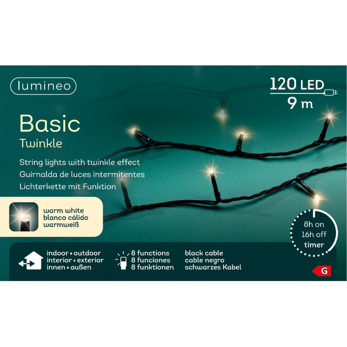 Kerstverlichting lichtsnoer met warm witte led lampjes. Maak een magische kerstsfeer met deze sfeervolle kerstverlichting met 120 warm witte LED lampjes. Het 9 meter lange lichtsnoer met zwart snoer is perfect voor binnen- en buiten gebruik en zorgt voor een feestelijke uitstraling rondom je huis of in de tuin. Dankzij het 8-functie twinkel effect kun je kiezen uit verschillende lichtstanden om de perfecte sfeer te maken.
