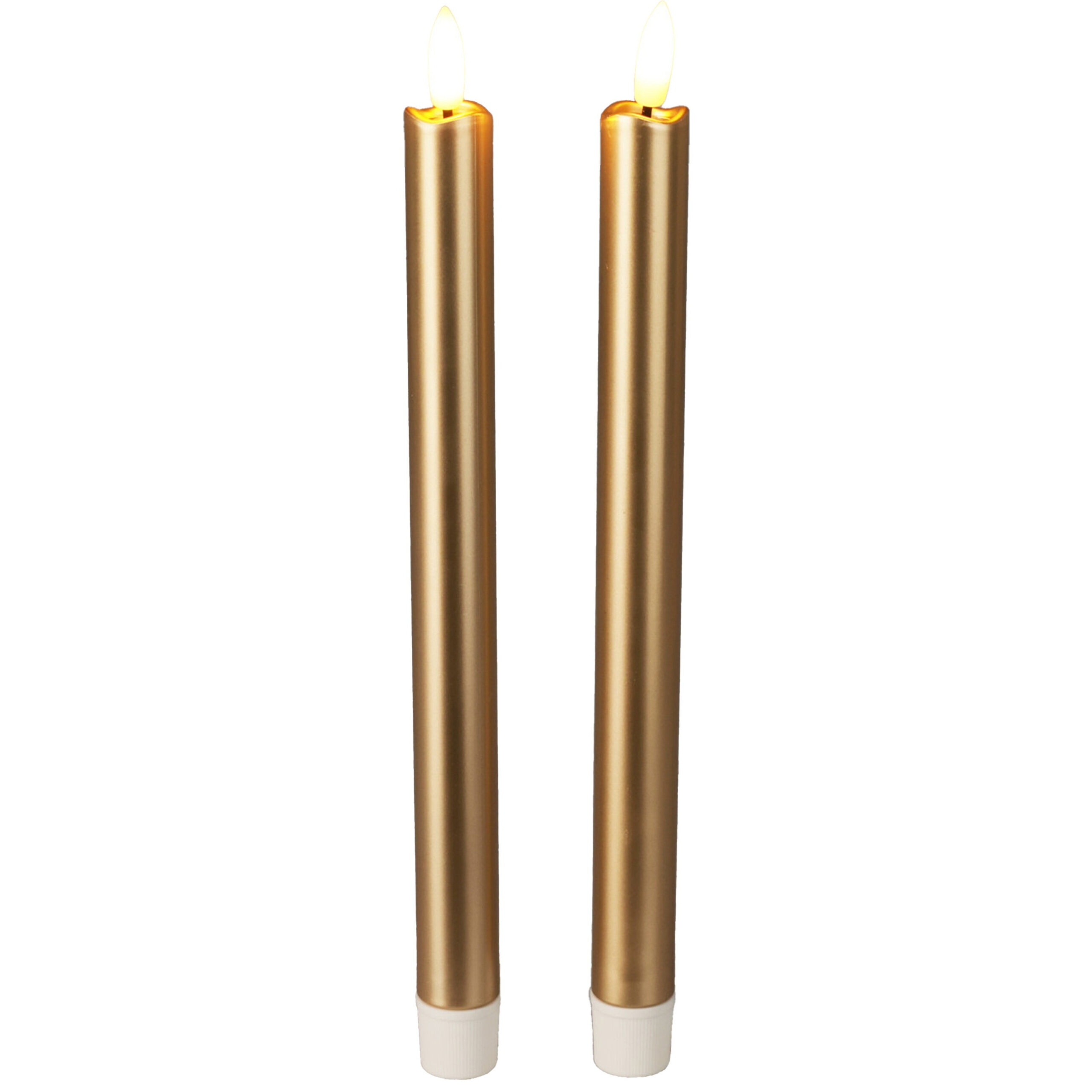 Set van 2x stuks gouden LED dinerkaarsen met afstandsbediening. Breng een warme en luxe sfeer in huis met deze set van twee gouden LED-tafelkaarsen. Het elegante ontwerp met een gladde afwerking en golfrand geeft een klassieke uitstraling, perfect voor feestelijke tafeldecoraties of romantische avonden. Dankzij de afstandsbediening en timerfunctie geniet je moeiteloos van sfeerverlichting.