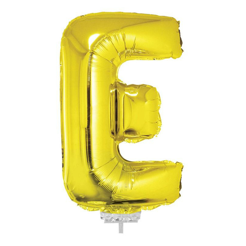 Gouden opblaas letter ballon E op stokje 41 cm. Gouden letter ballon E van ongeveer 41 cm. Incl. stokje. Alleen geschikt voor lucht.