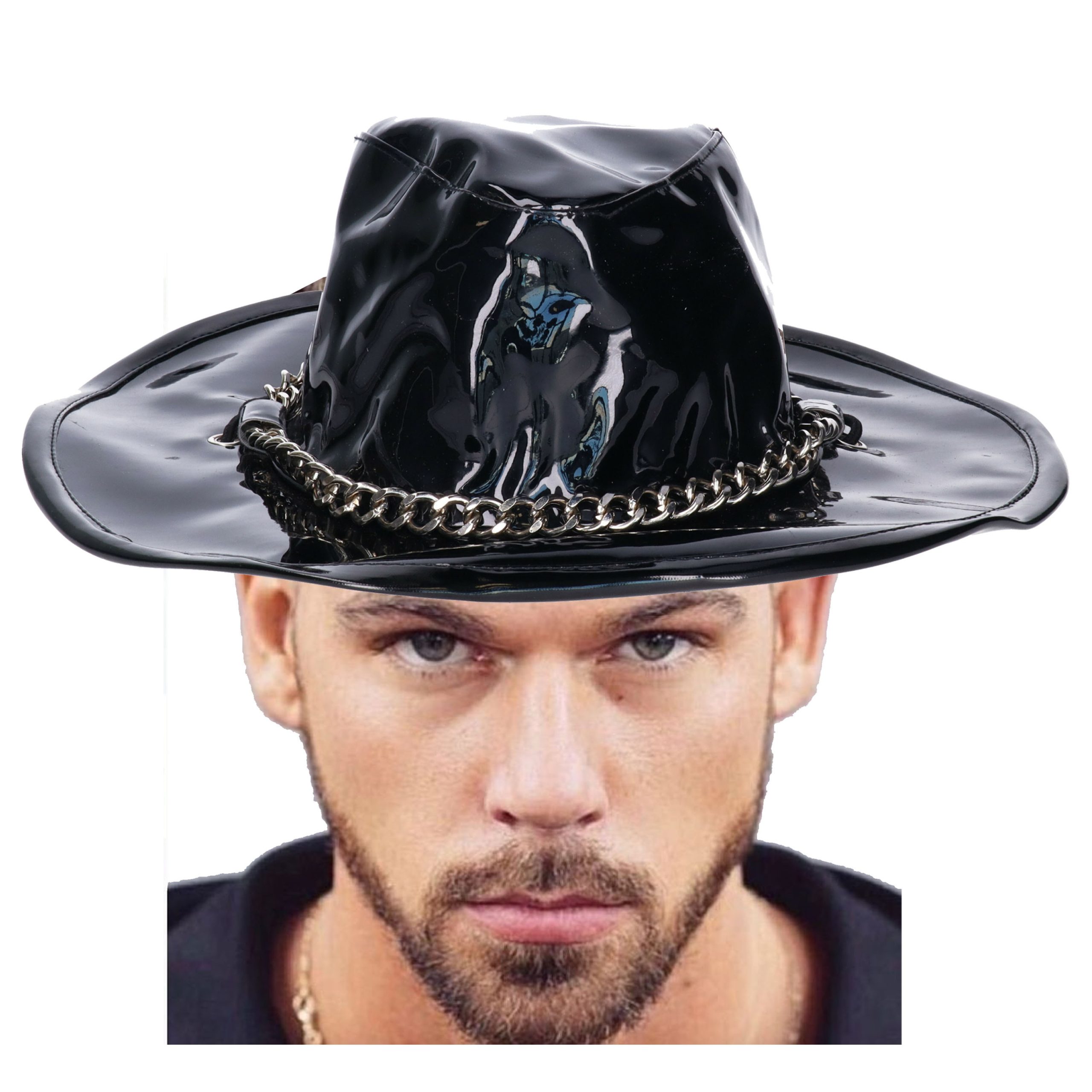 ? Zwarte glanzende zonnehoed met zilveren kettinkje
