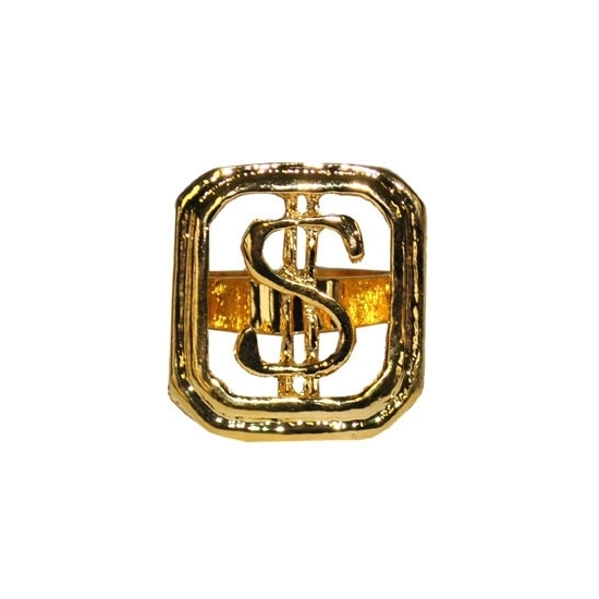 Carnaval/verkleed artikelen. Steel de show met deze opvallende gouden ring met dollarteken, een onmisbare accessoire voor jouw gangster-, pimp- of rapperkostuum! De ring is verstelbaar in maat en dus geschikt voor vrijwel elke volwassene.