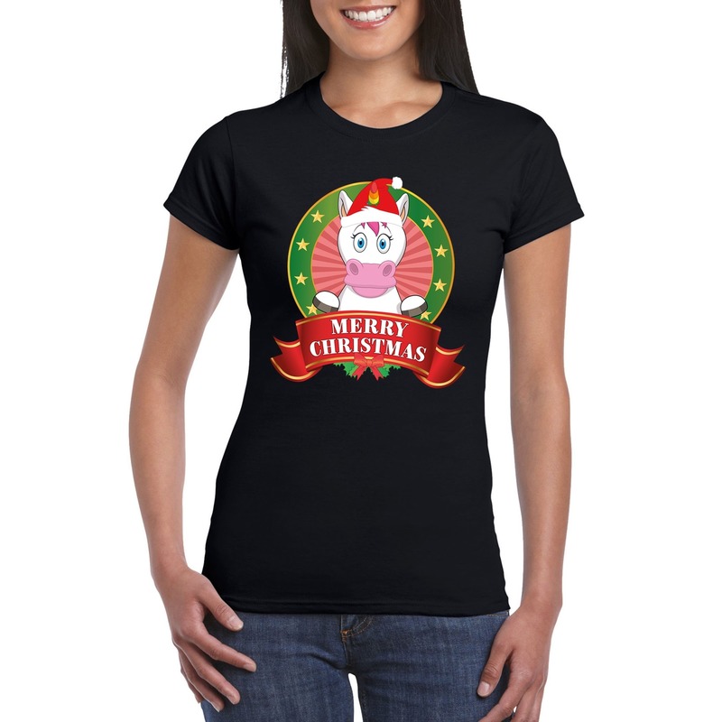 Foute kerst t-shirt zwart, voor dames. Dit shirt voor Kerstmis heeft een print van een eenhoorn die een kerstmuts draagt, met de tekst: Merry Christmas. Materiaal: 150 grams, 100% katoen.