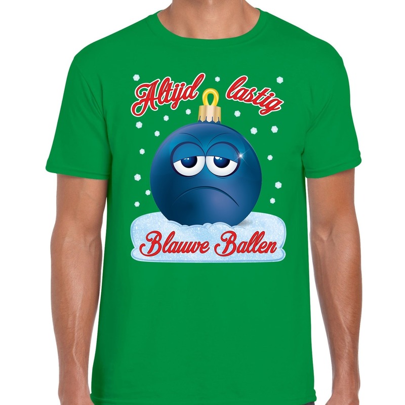 Fout Kerst T-shirt Blauwe ballen groen voor heren. Dit Kerst shirt / t-shirt is bedrukt met de afbeelding van een blauwe kerstbal en de tekst: Altijd lastig Blauwe Ballen. Dit kerstshirt / t-shirt is leuk om te dragen tijdens een kerstborrel of bij het gourmetten.
