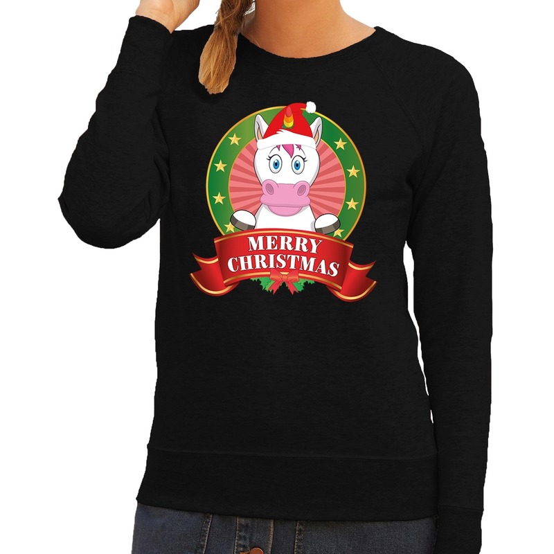 Foute kersttrui / sweatshirt zwart, eenhoorn, voor dames. De sweater is bedrukt met een afbeelding van een eenhoorn en de tekst Merry Christmas. Deze kersttrui/ sweater/ sweatshirt is van dun ongeborsteld katoen en heeft raglan mouwen. Het is dus geen dikke warme trui en kan prima gedragen worden op een kerstborrel of bij het gourmetten.