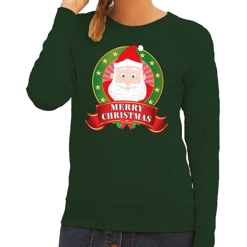 Foute kersttrui / sweatshirt groen, Merry Christmas, voor dames. De sweater is bedrukt met een afbeelding van de Kerstman en de tekst Merry Christmas. Deze kersttrui/ sweater/ sweatshirt is van dun ongeborsteld katoen en heeft raglan mouwen. Het is dus geen dikke warme trui en kan prima gedragen worden op een kerstborrel of bij het gourmetten.