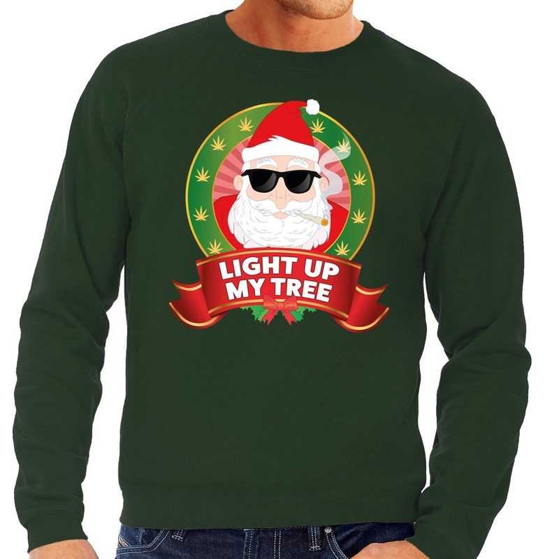 Foute kersttrui / sweatshirt groen, Light Up My Tree, voor heren. Deze grappige sweater voor Kerstmis heeft een print van een blowende Kerstman met een joint in zijn mond en de tekst: Light Up My Tree. Deze kersttrui/ sweater/ sweatshirt is van dun ongeborsteld katoen en heeft raglan mouwen. Het is dus geen dikke warme trui en kan prima gedragen worden op een kerstborrel of bij het gourmetten.