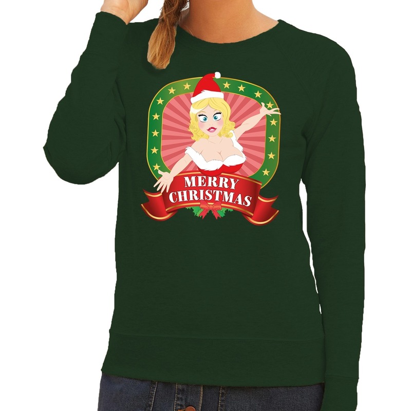 Foute kersttrui / sweatshirt groen voor dames. Deze dames sweater voor Kerstmis heeft een print van een sexy dame die een kerstmuts draagt, met de tekst: Merry Christmas. Deze kersttrui/ sweater/ sweatshirt is van dun ongeborsteld katoen en heeft raglan mouwen. Het is dus geen dikke warme trui en kan prima gedragen worden op een kerstborrel of bij het gourmetten.