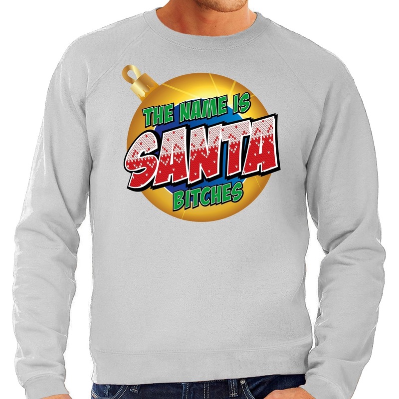 Foute Kersttrui The name is Santa bitches grijs voor heren. Deze Kerst trui / sweater is bedrukt met de tekst: The name is Santa bitches. Deze kersttrui / sweater / sweatshirt is van dun ongeborsteld katoen en heeft raglan mouwen. Het is dus geen dikke warme trui en kan prima gedragen worden op een kerstborrel of bij het gourmetten.