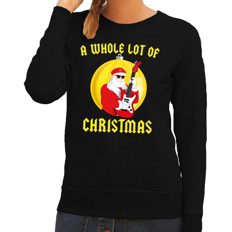 Foute kersttrui zwart A Whole Lot of Christmas voor dames. Deze grappige sweater voor Kerstmis heeft een print van Kerstman Angus die een gitaar bespeelt.