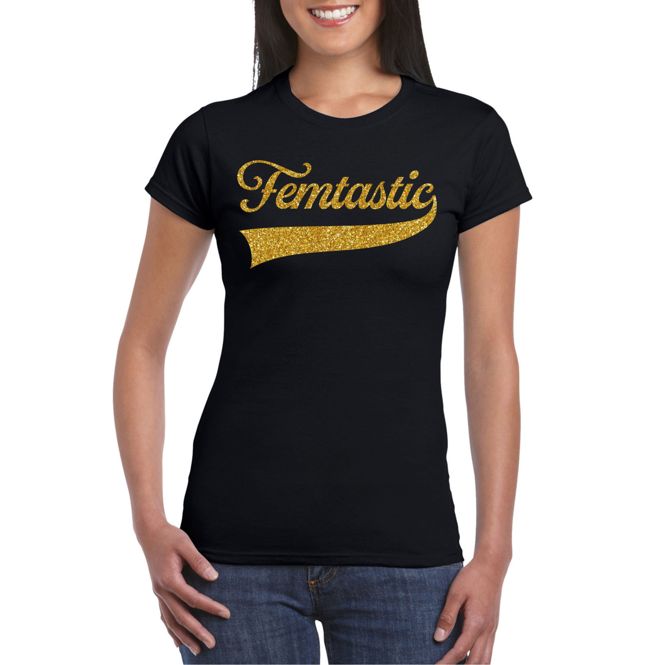 Foute party t-shirt voor dames in de kleur zwart met glitterbedrukking in de kleur goud. Het t-shirt is bedrukt met de tekst: Femtastic. Ga jij binnenkort naar een foute party, carnaval of themafeestje ? Dan is dit grappige t-shirt onmisbaar! Tevens is hij ook leuk om zomaar te dragen of tijdens het uitgaan/stappen. Materiaal: 145 grams, 100% katoen. Merk: Bellatio Decorations.