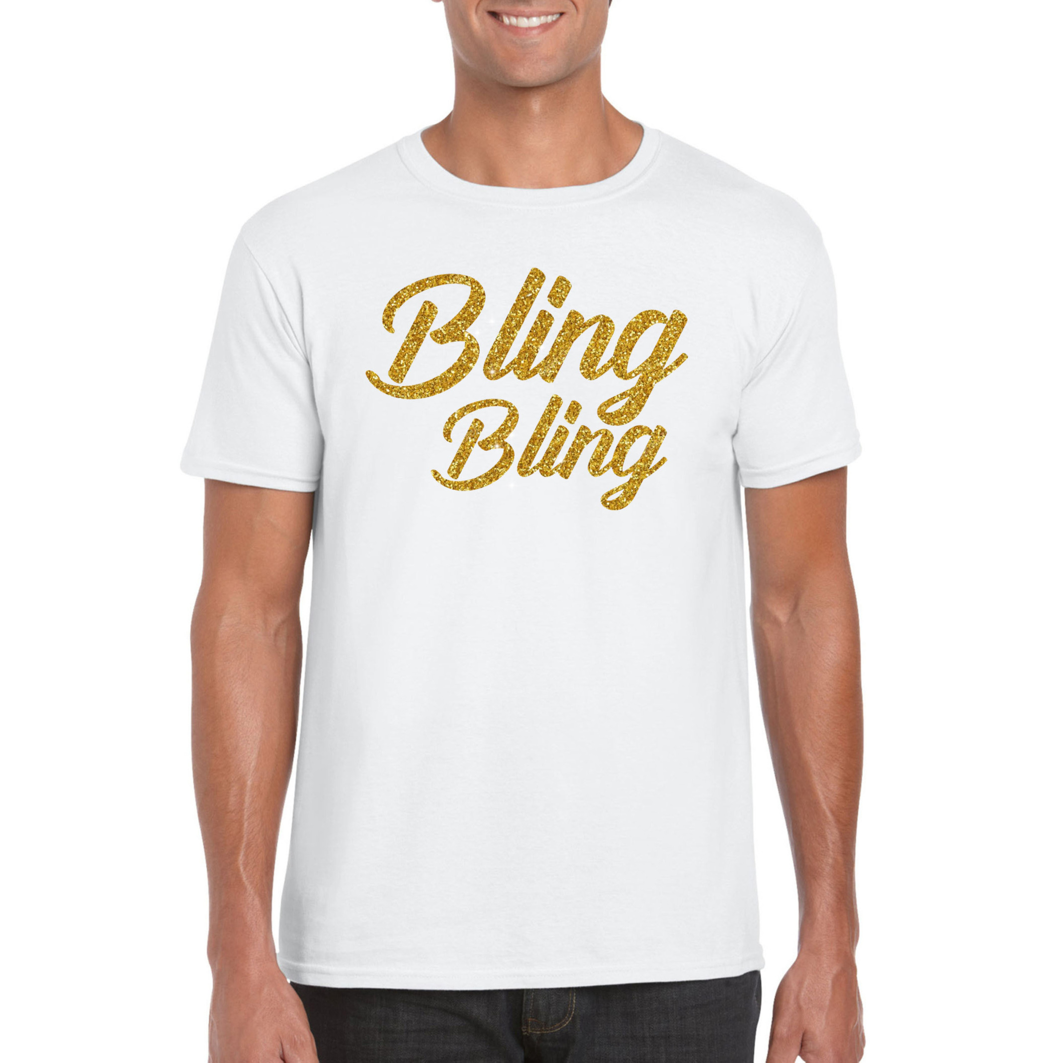 Glitter en Glamour feest t-shirt wit voor heren. Op dit shirt staat in goudkleurige glitter bedrukking de tekst: Bling bling. Leuk party t-shirt met goud kleur glitter tekst om te dragen tijdens een glitter en glamour feestje, bij Oud en Nieuw of een ander glitter en glamour evenement. Hou jij van glitter en glamour? Dan is dit een shirt voor jou!