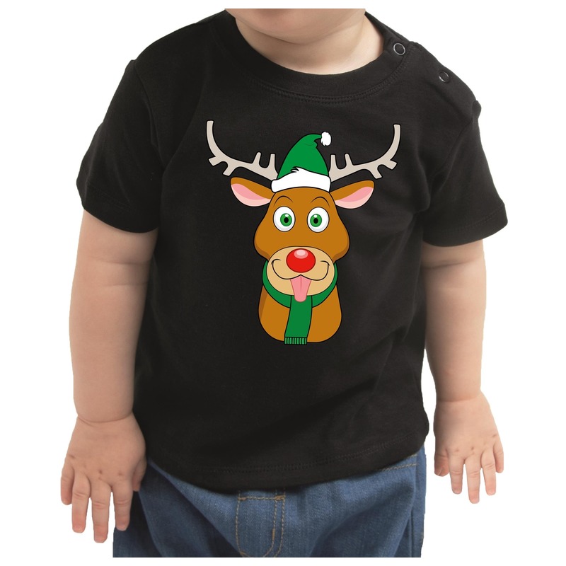 Kerst t-shirt Rudolf het rendier zwart voor baby jongens en meisjes. Op dit zwarte Kerst shirt staat de afbeelding van Rudolf het rendier met een groene kerstmuts/sjaal. Materiaal: 100% katoen, 180 grams kwaliteit.