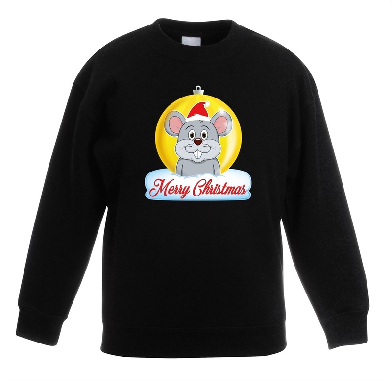 Kersttrui Merry Christmas muis kerstbal zwart voor jongens en meisjes. De sweater is bedrukt met een afbeelding van een kerstbal met muis en de tekst Merry Christmas. Materiaal: 80% katoen en 20% polyester (260 grams)