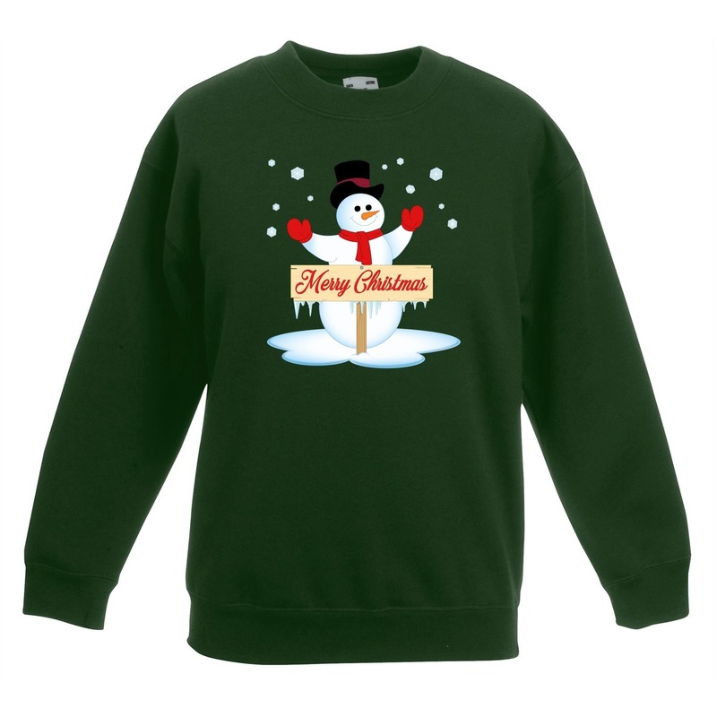 Kersttrui met sneeuwpop groen jongens en meisjes. De sweater is bedrukt met een afbeelding van een sneeuwpop en de tekst Merry Christmas. Materiaal: 80% katoen en 20% polyester (260 grams)