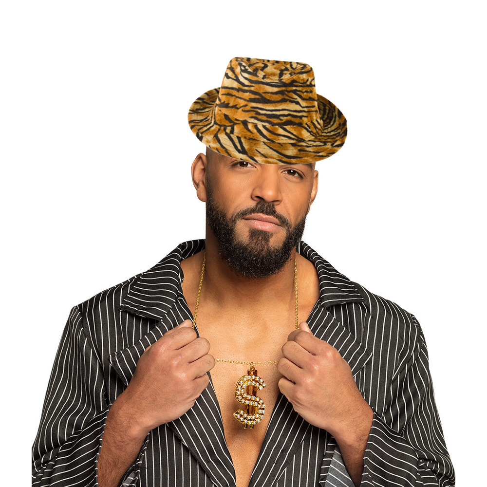 Foute party PIMP verkleed set voor heren. Een 2 delige accessoires set bestaande uit een tijger print hoedje, en een grote gouden schakelketting met dollar teken. Je kan verder je gewone kleding zoals overhemd en pantalon gebruiken, maar leuker is een bijpassend verkleedkleding kostuum of verkleed thema t-shirt. Deze kunt u ook in onze shop vinden. , Dit artikel bestaat uit:, 1x Verkleed hoedje Party Kojak hoed met tijgerprint – bruin mix – volwassenen – Carnaval/pimp/festival/, 1x Carnaval/verkleed accessoires Pooier/pimp/gangster sieraden – dollar ketting – goud – kunststof