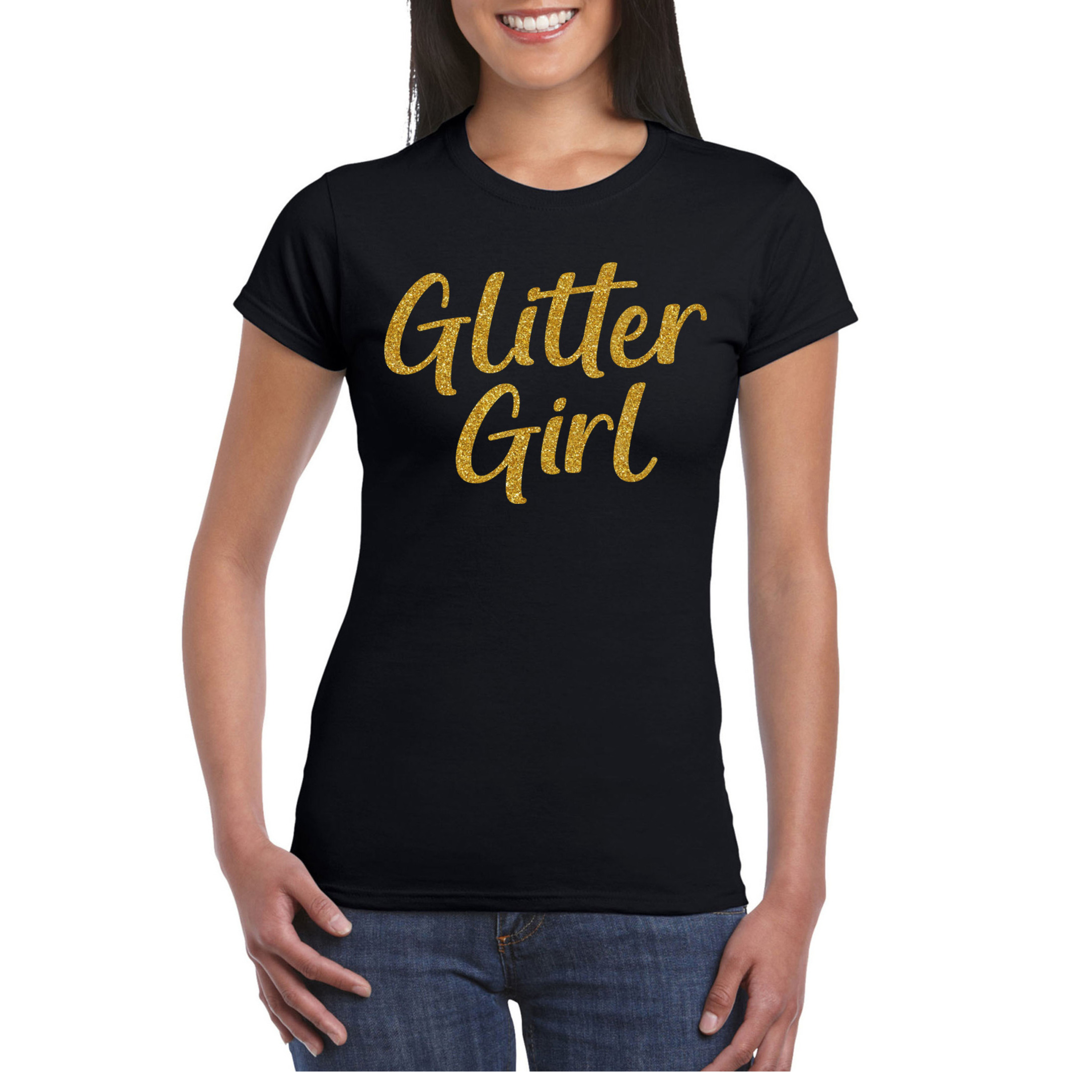 Verkleed T-shirt voor dames in de kleur zwart met goud glitter opdruk. Op het shirt staat de tekst: glitter girl. Heb jij binnenkort een feestje, carnaval of thema feest? Dan is dit shirt onmisbaar! Met de glitters val je zeker op! Het shirt is ook leuk om cadeau te geven of te dragen tijdens het uitgaan/stappen. Materiaal: 145 grams, 100% katoen. Merk: Bellatio Decorations.