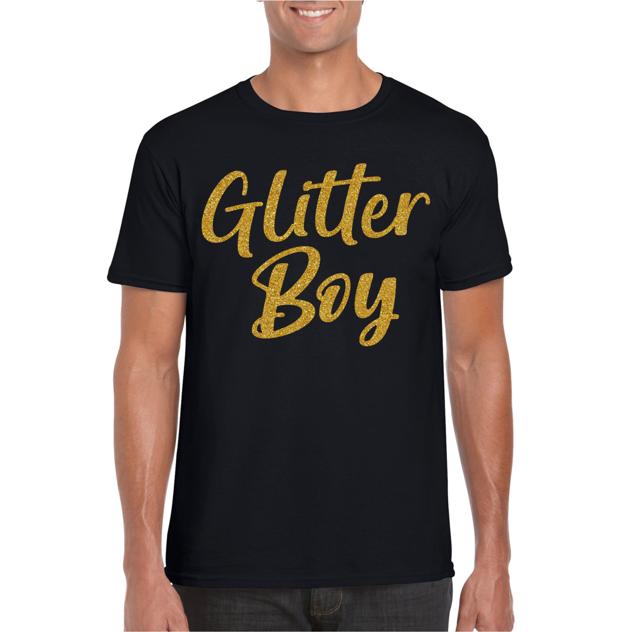 Verkleed T-shirt voor heren in de kleur zwart met goud glitter opdruk. Op het shirt staat de tekst: glitter boy. Heb jij binnenkort een feestje, carnaval of thema feest? Dan is dit shirt onmisbaar! Met de glitters val je zeker op! Het shirt is ook leuk om cadeau te geven of te dragen tijdens het uitgaan/stappen. Materiaal: 145 grams, 100% katoen. Merk: Bellatio Decorations.