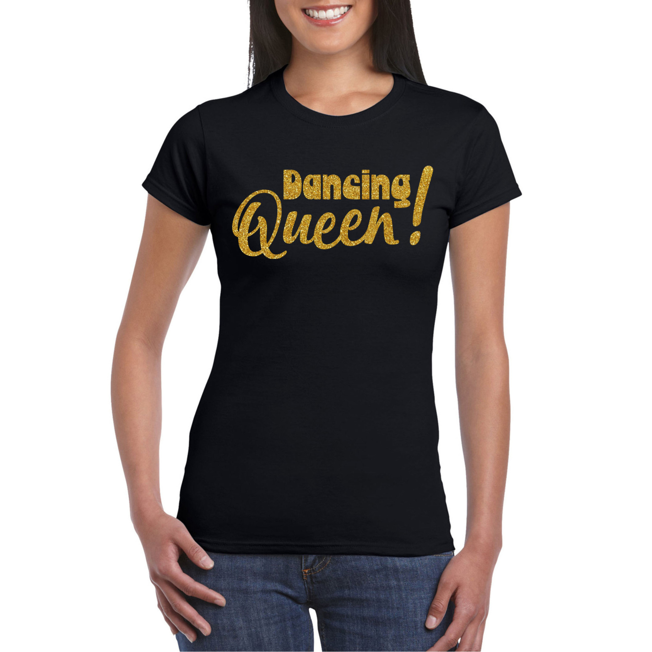 Vrijgezellenfeest t-shirt voor dames in de kleur zwart met gouden glitter opdruk. Het shirt is bedrukt met de tekst: Dancing Queen! Heb jij binnenkort een vrijgezellen feest, een foute party of ga je stappen met vriendinnen tijdens een Ladies Night? Dan mag dit leuke t-shirt niet ontbreken! Trek hem samen met je vriendinnen aan om te matchen en geniet van een gezellige avond uit!