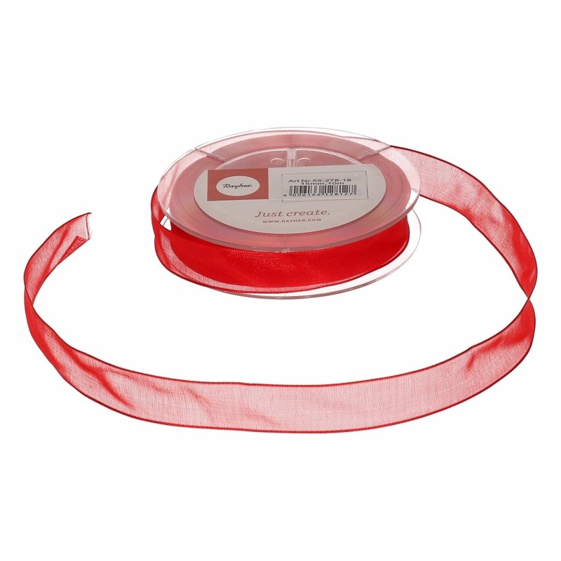 Hobby/decoratie organza sierlint in de kleur rood, 1,5 cm/15 mm x 10 meter. Organza linten op rol.