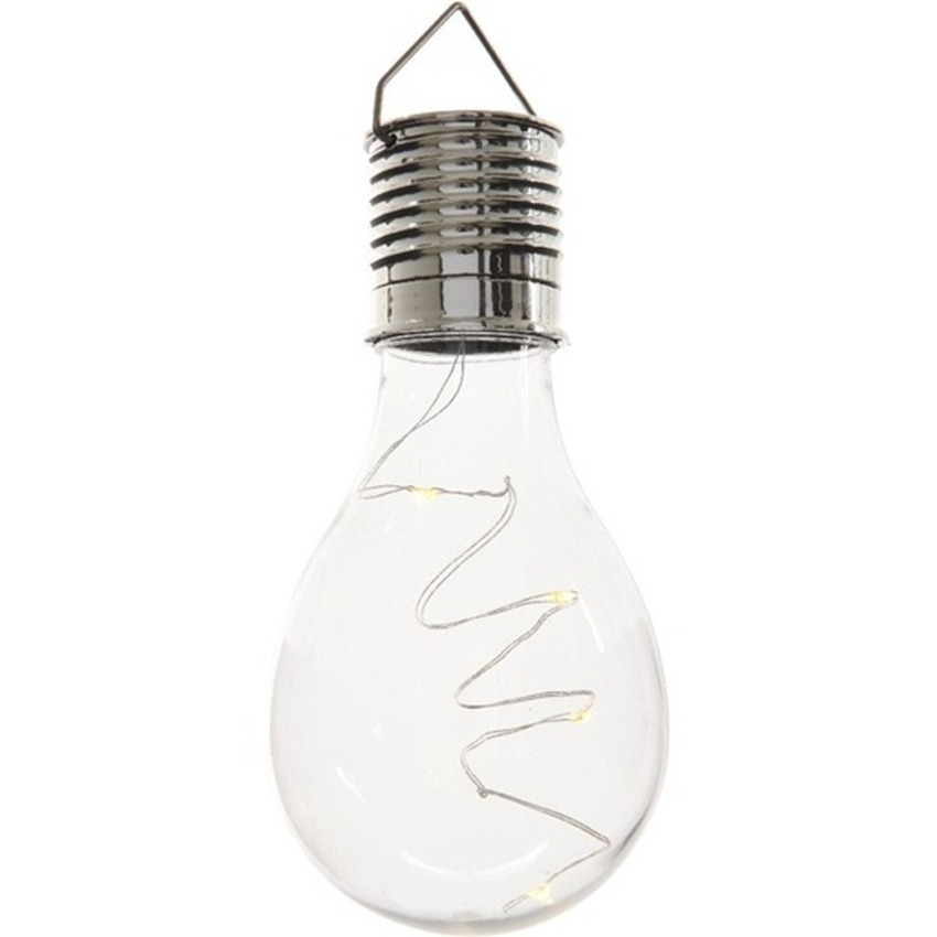 Buitenlampjes/tuinlampjes LED solar verlichting hanglamp lampbolletjes/peertjes. Verlicht het tuinpad/looppad of hang het peertje op in een boom of langs de rand van een veranda. De lampen zijn milieuvriendelijk aangezien ze zelfvoorzienend zijn in stroom dankzij de zonnepanelen. U kunt de lamp overal plaatsen en ook weer verplaatsen omdat u geen elektriciteitsdraden hoeft te spannen. Type: Bulb Transparent. Materiaal: RVS, kunststof. Formaat diameter: 8 cm, hoogte: 14 cm. Kleur licht: warm wit. Branduren indien volledig opgeladen: ca. 6 uur. De brandduur hangt af van de weersomstandigheden, 8 uur volle zon zorgt voor een maximaal aantal branduren. Het draadje in het bolletje bevat 4 lampjes, de lampjes zijn niet vervangbaar. Tuinverlichting tuinpad tuindecoratie zonne-energie solarlamp.