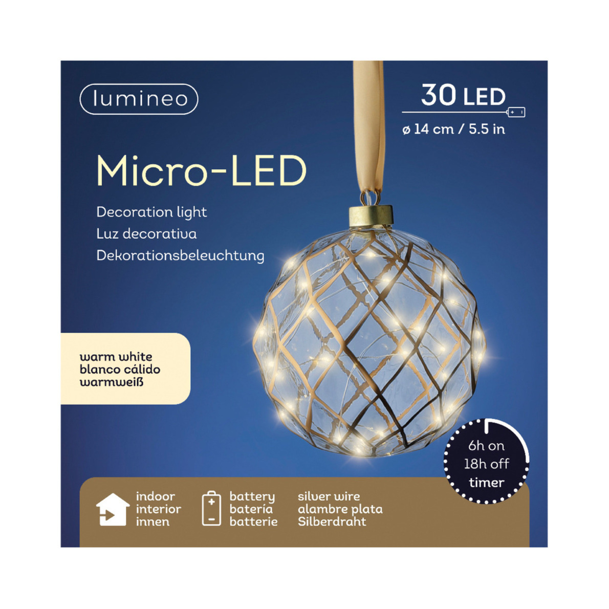 Verlichte kerstbal van glas aan een lint van 100 cm. Gemaakt van glas en met een elegant goud lint, straalt deze kerstbal een tijdloze en feestelijke uitstraling uit. Met een diameter van 14 cm is deze kerstbal voorzien van 30 warm witte LED lampjes die een gezellige gloed verspreiden. Deze kerstbal met led verlichting werkt op 2 AAA batterijen (niet inbegrepen) en heeft een timerfunctie van 6 uur aan en 18 uur uit, waardoor je kunt genieten van de verlichting zonder je zorgen te maken over het handmatig inschakelen en uitschakelen. Met een IP-klasse van IP20 is deze kerstbal geschikt voor gebruik binnenshuis.